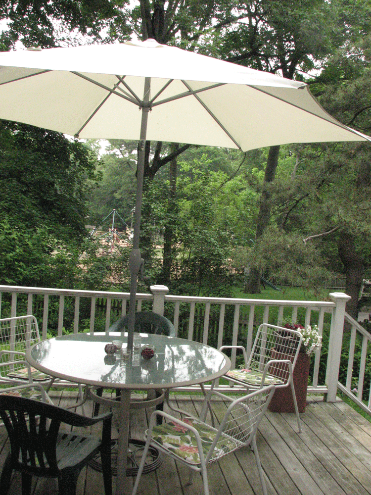 This is the view just over the deck rail — my neglected backyard!