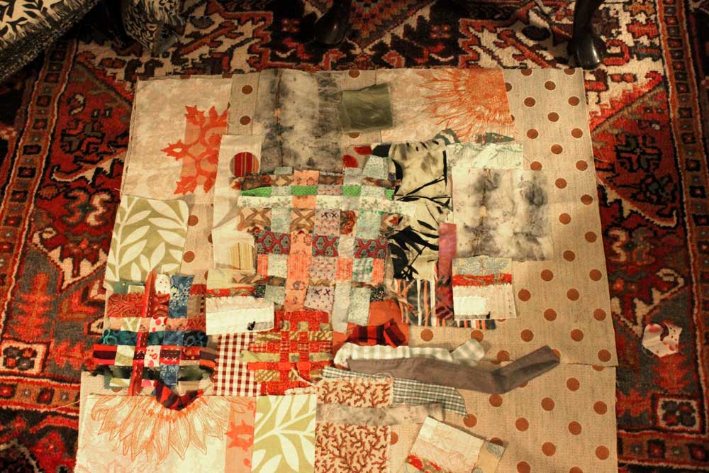 tomorrow held a big block of silence and unstructured time in which I could figure out how to work with woven squares, uneven scraps, and beautifully dyed fabric (a recent purchase from arlee!) in a whole new way — maintaining the spontaneity of collage and the wandering edges of overlapping… without getting into the frustrating business of turning everything into rectangles — which is what I did with the “Treasure Island Quilt for a Boy” (I finished it, BTW!!! I Finished it yesterday!!)