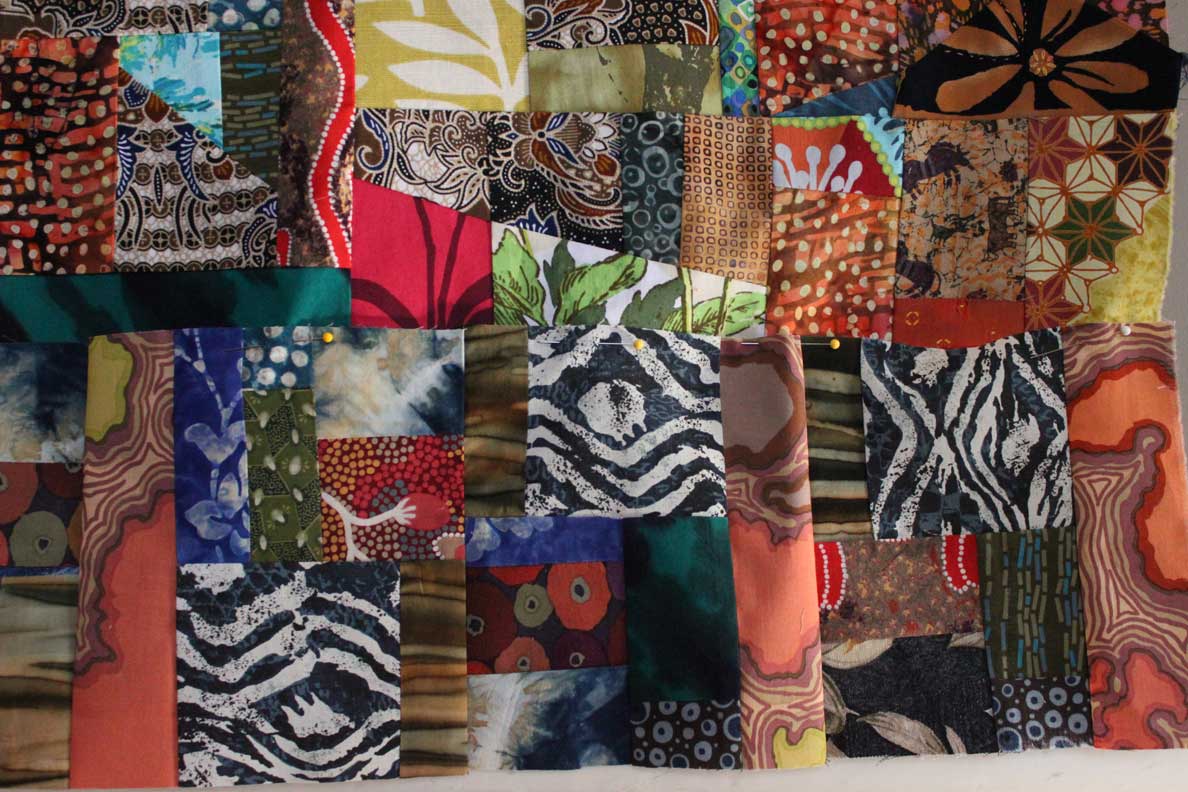 So, yesterday, in spite of three appointments, necessary emails, and then the usual Monday stuff, I managed to build the lower edge by patchworking a series of (nearly) matching 5×5 inch squares (roughly).