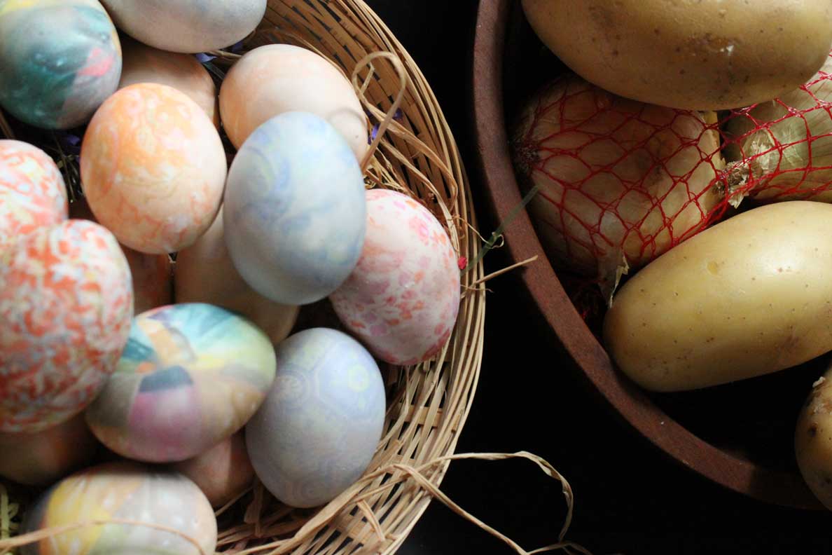 The last step will be to rub them with a little canola oil, for some shine. I used whole eggs, but next year (I say this now), perhaps I will blow some eggs in order to create some that will hold year-to-year (then I understand that you have to get a little clever about weighting them down in the pot so that they don’t float).