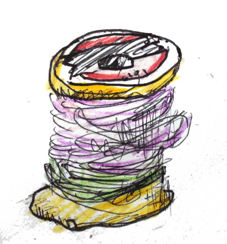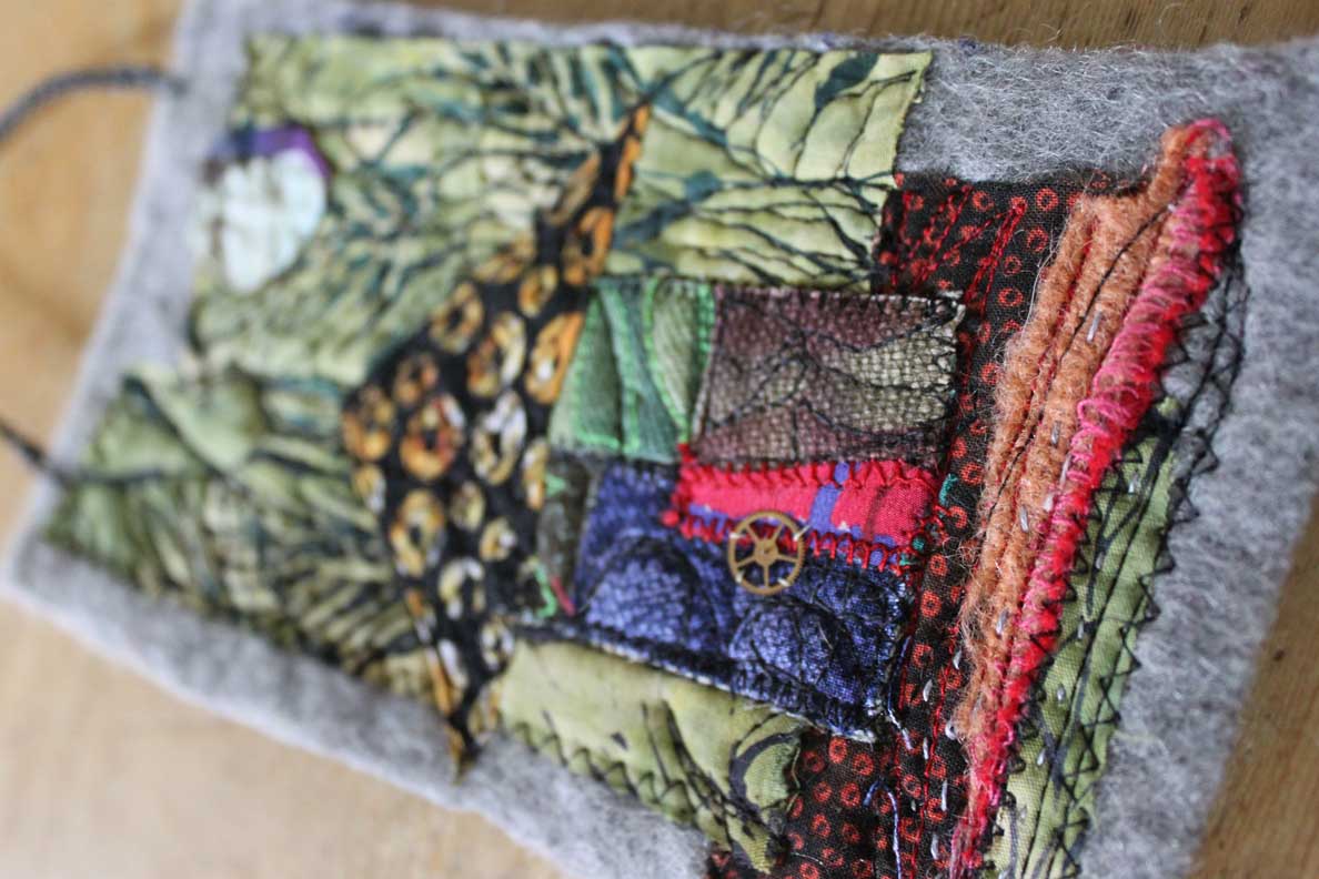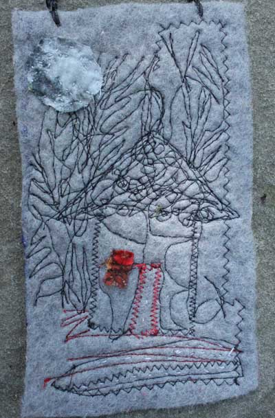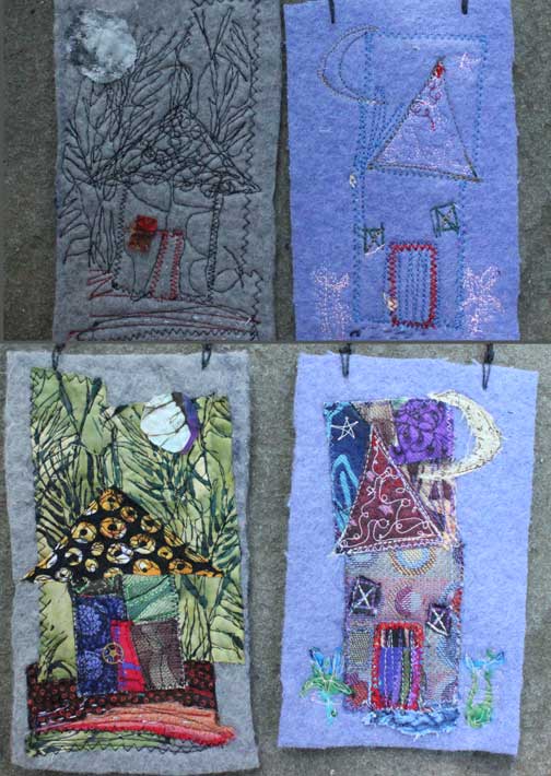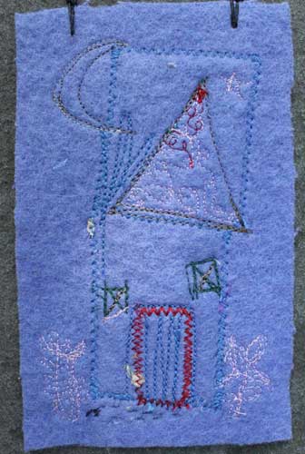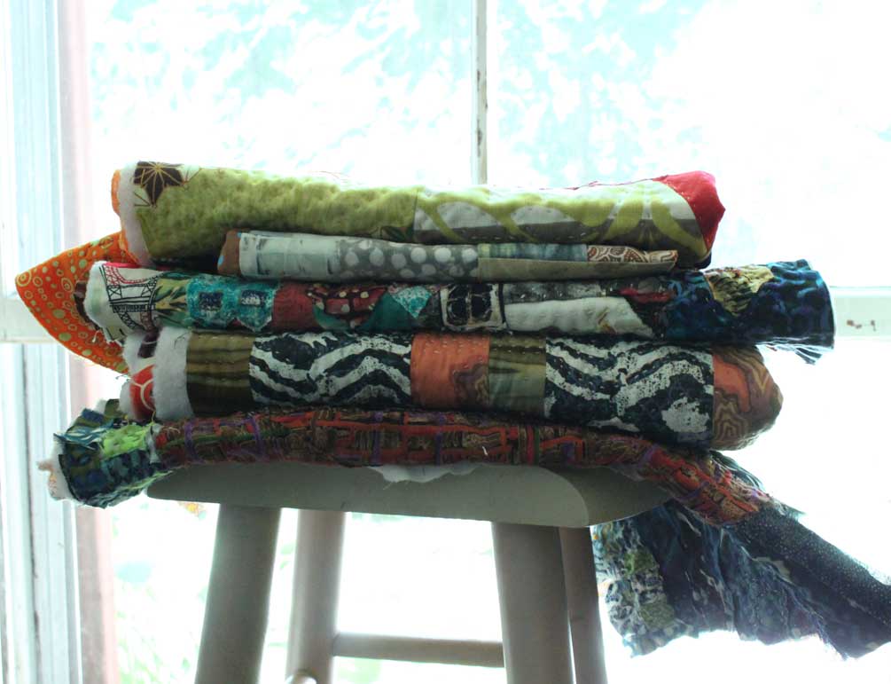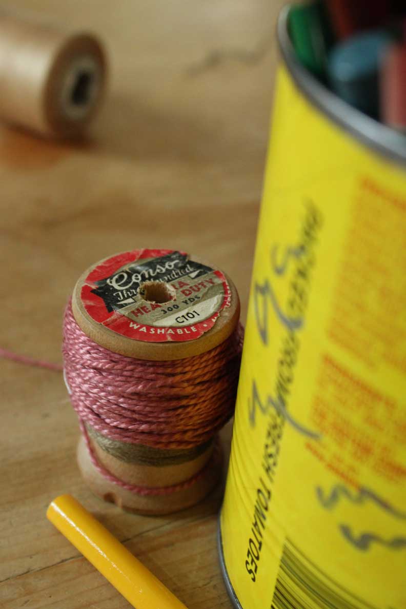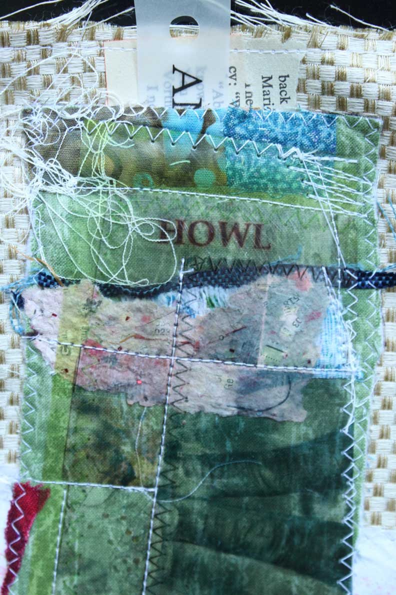 My best moments, of late, come in the basement… where there is no season, no tide or influence, just stuff wanting to be chucked, folded, or assembled. It’s cool down there. Scraps that I saved got stitched into this assembly this morning. The pink handmade paper (center) dates back to when we renovated our house. Stuffed in the walls of the old kitchen were newspapers… I saved them, whirred them up in a blender and pulled them into sheets. Ads for clothing and rugs for sale in Framingham. Words that had been in the walls. This batch might have been made with four year olds at C’s nursery school (clue? the pink sparkles). THAT tells me the paper is 14 years old.