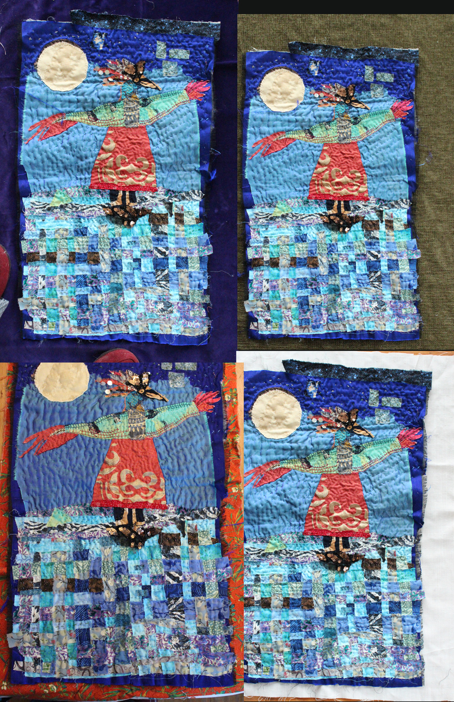 The blue silk frayed like mad. The NEXT time I used silk for a background, by the way, I ran a line of machine stitching along the side prone to giving off its threads. The lost cloth here created a bit of a challenge – but not too bad. Mostly, I was sorry to see so much of that Noxzema blue go. After trimming the batting off, I auditioned backgrounds, with the idea that I would put the whole thing onto another cloth.