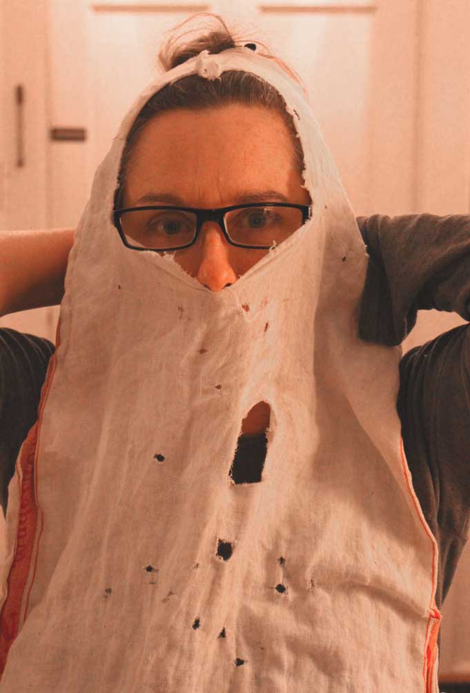 SERIES. The new series is comprised of self portraits, any of which could be captioned: “me looking deranged”. This makes No. 2. (No. 1 in flickr stream recently). This well-loved Irish Linen dish towel (I think “linen” warrants a capital “L” here) was finally retired from its kitchen duties last night.
