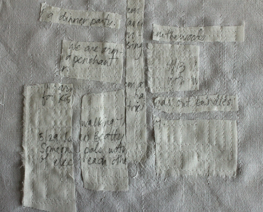 To me there is something powerful about ‘whitening’ a chunk of personal narrative. I’m not sure why. It may have to do with aging away from drama. It may speak to the non-linear qualities of memories – how they can be rearranged, fragmented, or removed from the frame altogether. Or, it could be that the ordinary domestic process of stitching fragmented stories back together reenacts a healing process.