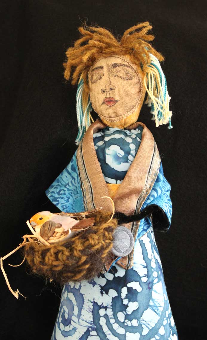 Two dolls in progress. Place markers for heads. One, punctured metal, letting light through. One, a paper-pieced hexagon, letting light through.