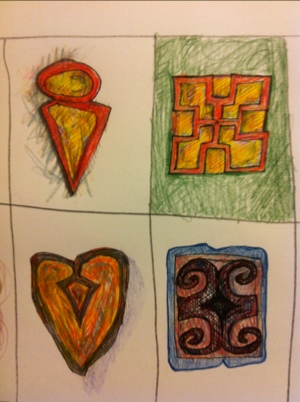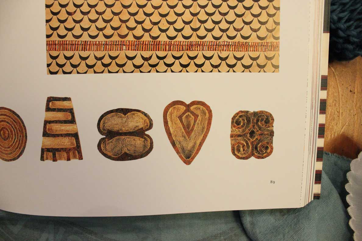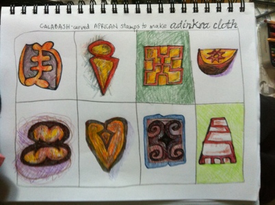 The book, African Textiles, is mine and I have barely scratched its surface – ALSO inspiring. For those who don’t know, adinkra fabrics are produced by the West Coast Africans in Ghana. The process described by Gillow goes like this — makers carve the gourds and create a handle from palm splints. The printer draws a grid onto the cloth that is to be stamped. “A thick dark goo” is made by boiling badee tree root bark that has been mixed with iron slag. The printer then prints with the gourd stamps onto the cloth and the fabric is then hung outside overnight “to catch the dew”.
