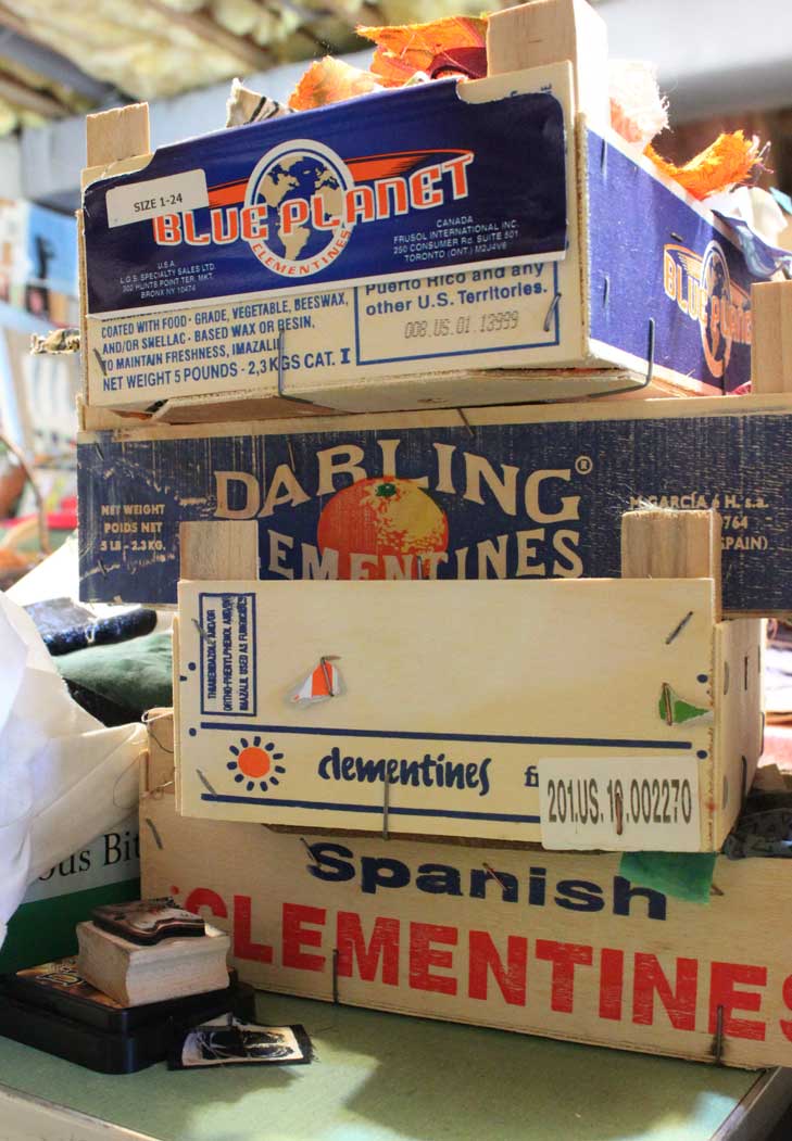 Precious scraps generally live in clementine boxes, which I love because they can be stacked like Lincoln Logs, and transport easily for an upstairs sewing session. I also spray painted the sides of some tray-like boxes from Costco, and labeled them. What’s in these trays doesn’t necessarily correspond to their labels anymore, but they hold things like strips cut for string quilting or binding; pressed scraps; fabric with words printed on them. I like ‘trays’ because they can be slid into the shelving above a fabric bin.