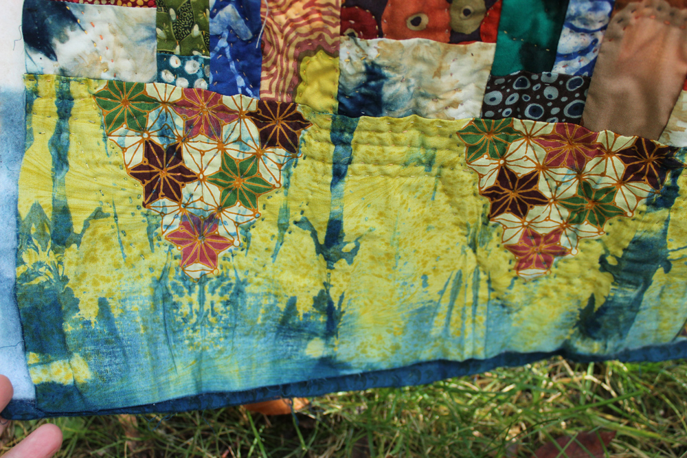 The indigo edge visually relates to purchased hand-dyed fabric pieced above the border, which is nice. I think the process would’ve worked better had I dyed the cloth prior to piecing — the batting absorbed a lot of the dye that might have otherwise saturated fabric, for one thing. Below, is a section of the quilt that did NOT get immersed.
