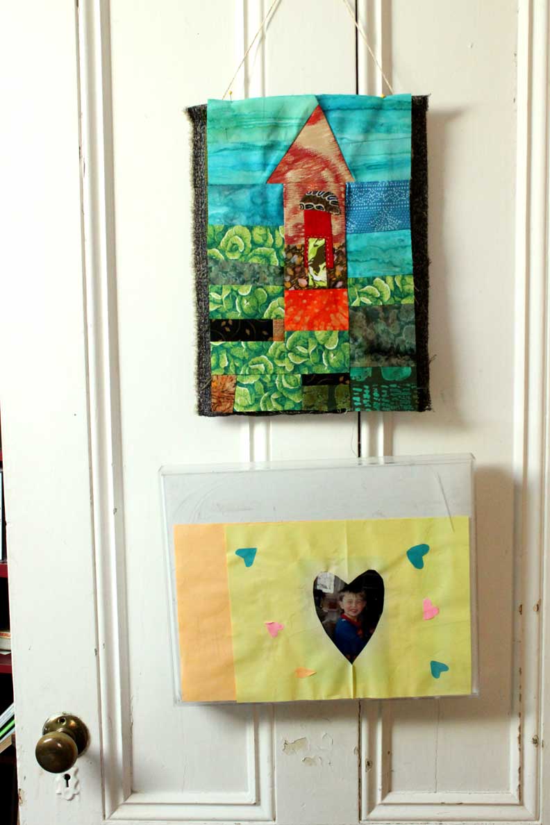Improv quilting note — if one is including heavy weight fabrics, sometimes the direction of pressing will be determined by the fabric’s weight, rather than where one wishes the emphasis to go. With this little tower, I would have pressed all the diagonal orange seams TOWARDS the roof if I were working with all quilting cottons, which would have emphasized the roof, making it pop a little. Instead, because that orange upholstery fabric was so thick, I had to press toward the blue.