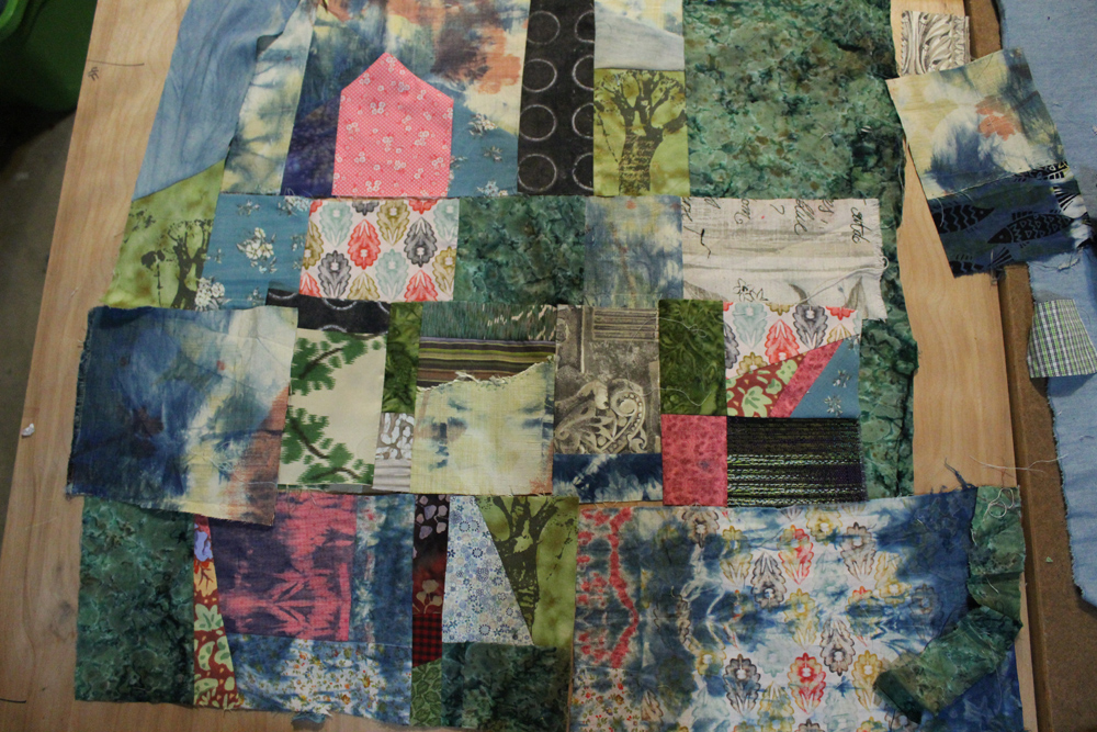 In this one, the structure is merely hinted at, and the landscape has been granted license to be wild and dominant. Not a surprising choice, given the rampaging punches that Sandy delivered over the weekend, while I was safely working down in my cellar studio. This composition features some more of my indigo dips, as well as silk from my upholstery-design-contact, quilting cottons, batiks, and that Lonni Rossi broccoli/tree fabric that I so love.