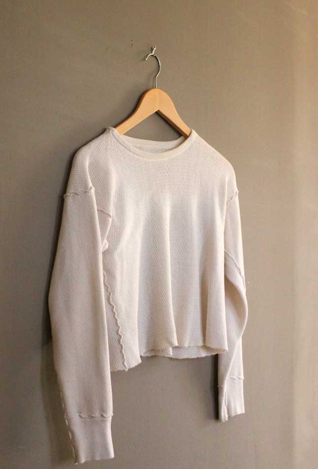 In any case, my first project, above, aims to be a little more pedestrian and less time-consuming than many of my inspiration sources. I had already cut the bottom off of the waffle weave shirt, which is worn to a comfortable softness, slightly stained, and currently too-short (oops!) to wear even as a pj top.