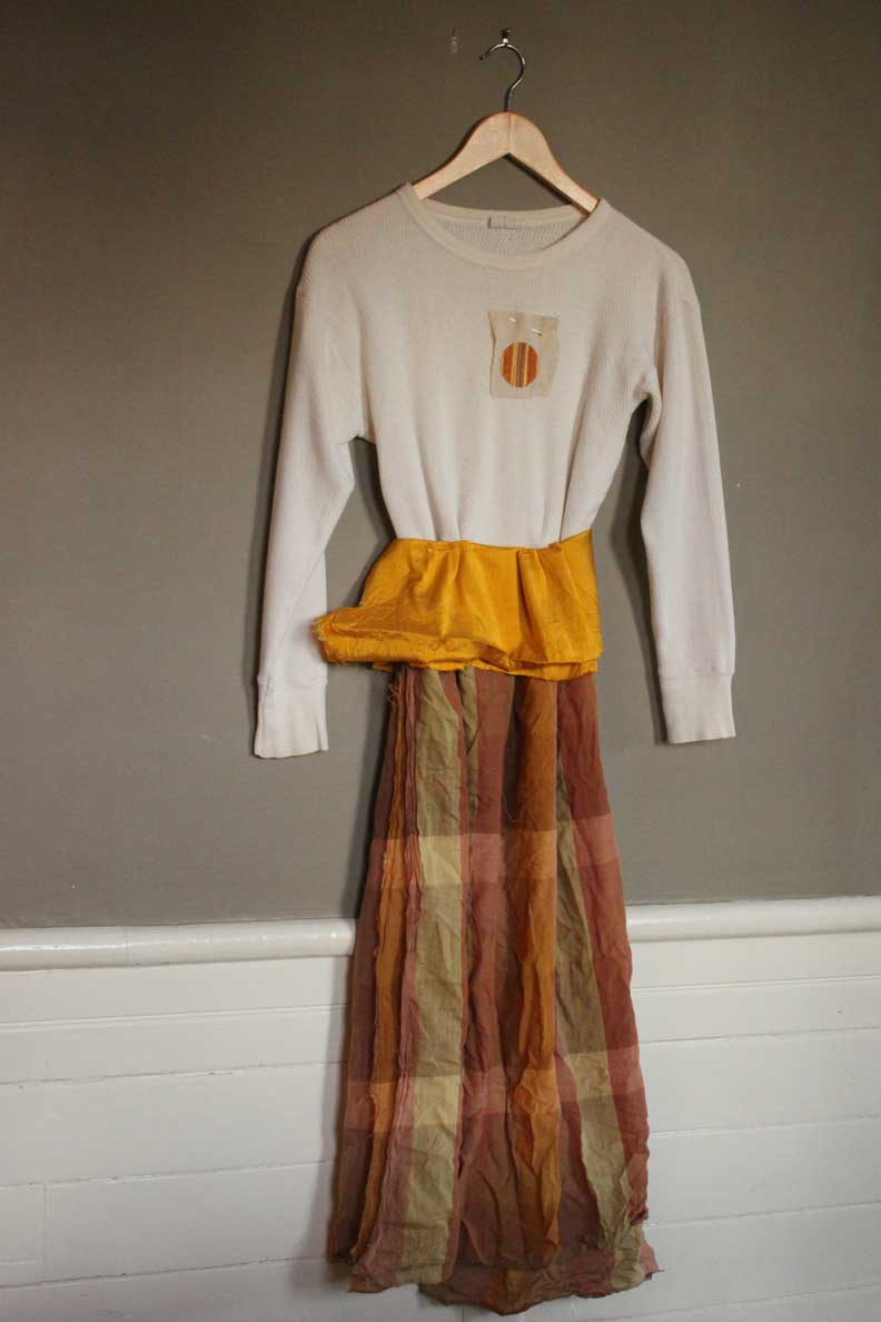 I have pinned a tissue-thin plaid as a skirt, some double-folded silk as a mini-peplum, and attached a swatch of embroidered linen over a hole in the chest. Of course, it would be great to dye the cotton top first, but I’m not there yet.